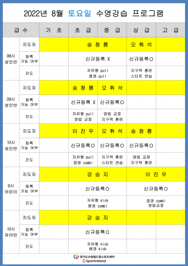 8월 토요일 수영강습반 프로그램(성인 / 어린이) ♥ 페이지 정보 작성자 관리자 댓글 0건 조회 5,487회 작성일 22-07-20 17:16 본문 ※ 본 현황의 등록가능 여부는 매월 신규등록 시작일(23일) 기준입니다. 이후의 등록가능 여부는 변동될 수 있습니다.※ 평균적으로 접영 진도부터 오리발을 사용합니다. 참고하시어 준비 부탁드립니다. 목록 이전글8월 아쿠아로빅 강습반 프로그램(월,수,금 / 화,목) ♥ 22.07.20 다음글8월 평일 어린이 수영강습반 프로그램(월,수,금 / 화,목) ♥ 22.07.20 댓글목록 댓글목록 등록된 댓글이 없습니다.