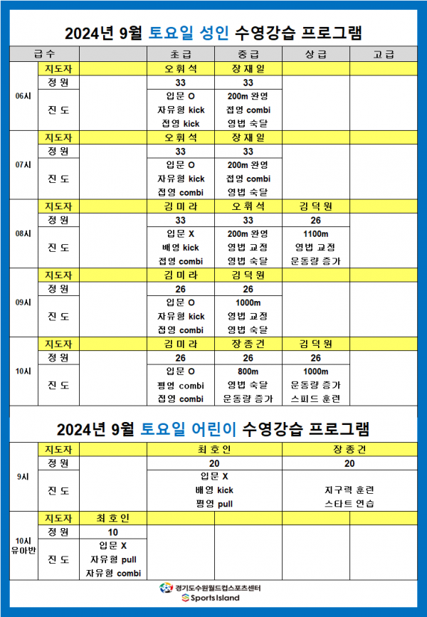 2024년 9월 토요일 수영강습반 프로그램(성인 / 유아·어린이)